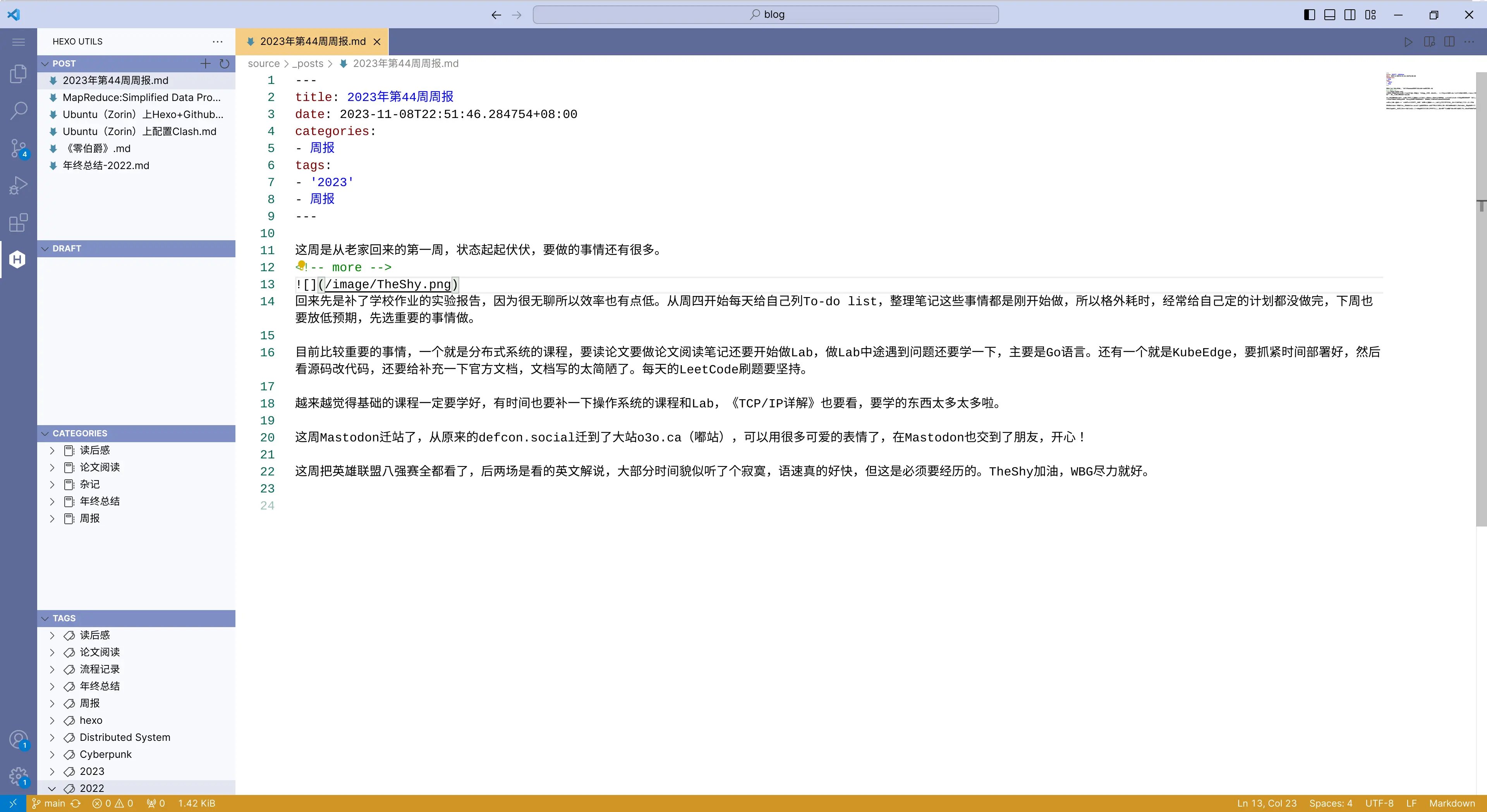 后半周花了很多时间在博客上,因为不想每次写博客都创建一个新的markdown文件,复制粘贴发文格式然后才能开始写,一开始把博客迁到了xLog,原以为这样问题就解决了,因为不管是导入原文章还是博客外观,发文方式什么都让我很满意,但是我发现一个致命问题让我很难受,添加标签网页会直接crash(不知道其他人有没有这样的问题)(后续:从Zorin换成Windows后就没有这样的问题了...所以我就迁到xLog了,VSCode上还是太麻烦了...主要是我太懒了...一想到要打开VSCode调格式加图片,写作的欲望就消失了...)。之前的文章都是导入的所以不需要加标签,也就没发现问题。原本这样也还好,那就像之前一样导入进去就好了,但是如果想给已经发出去的博客添加之前没有过的标签是不行的,似乎需要把原博客删掉然后改好标签再导入,这种解决方法就太繁琐了,违背了迁移博客的初衷,所以我想看看还有没有别的解决方案。之前在一位前辈那里看到他似乎在用一个类似xLog的博客后端,我感觉也挺方便的,网上找到一个,Vercel上部署了一下感觉效果不好就放弃了。又找了其它写作平台,发现这些写作平台几乎都是不能加tag的,就都放弃了。还看到有用Notion做博客的方法,但是有点麻烦,最主要的是外观不太能接受。btw,我去问了那位前辈在用的博客写作后端,他说他现在直接用VSCode了,然后我又去看了VSCode上Hexo的插件,感觉有一个是很满意的,受此启发我又看了看Notion和Obsidian有没有相关的插件,都不太满意。最后还是决定用Hexo搭网站用VSCode写文章。