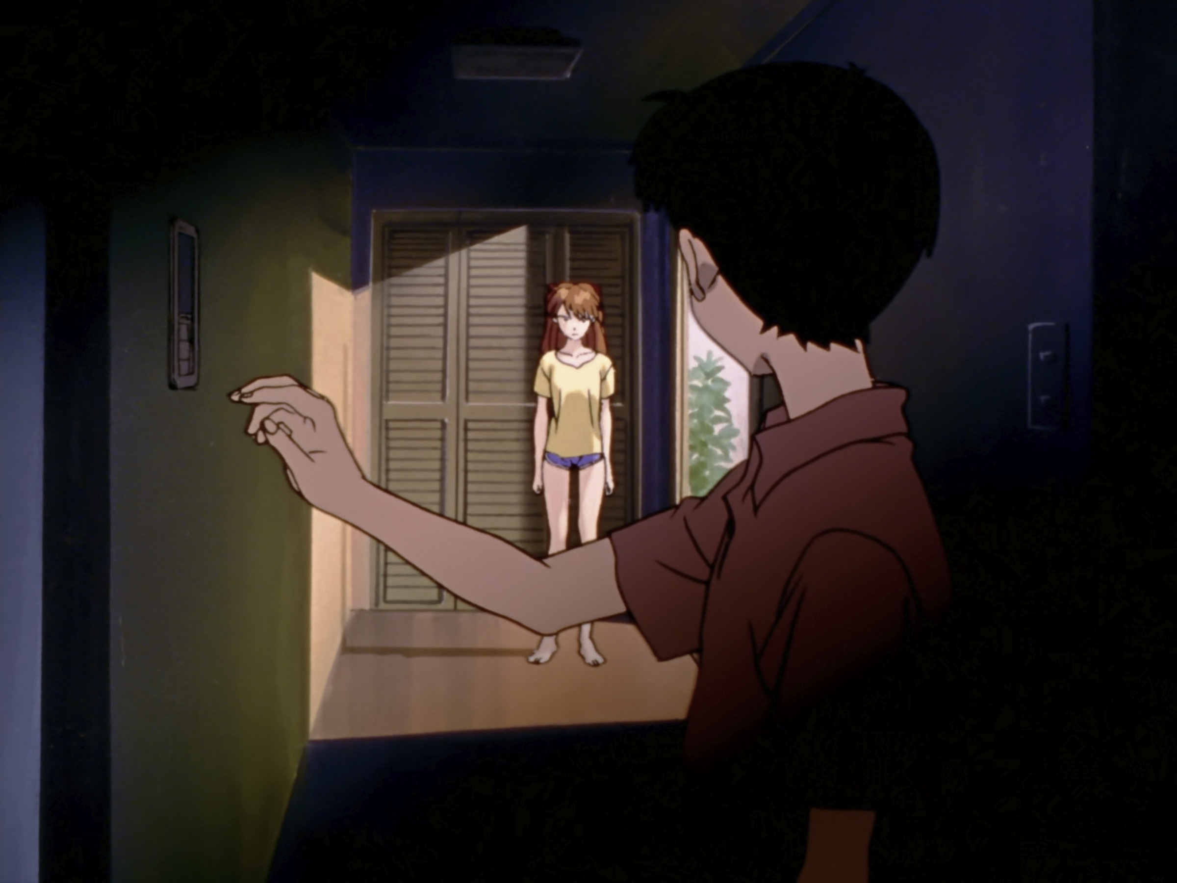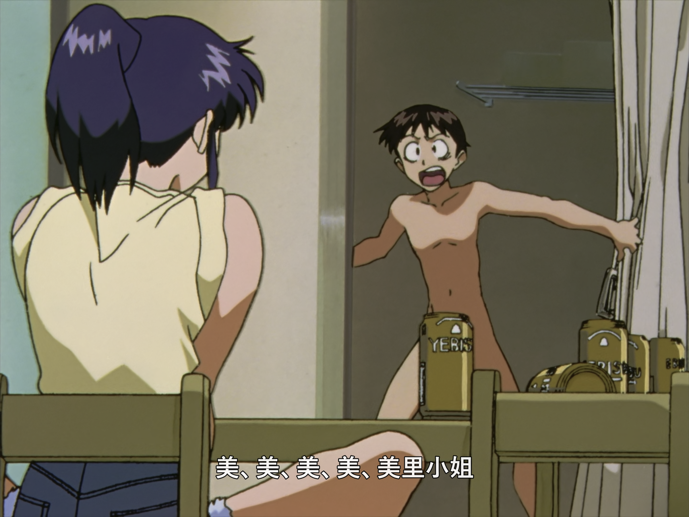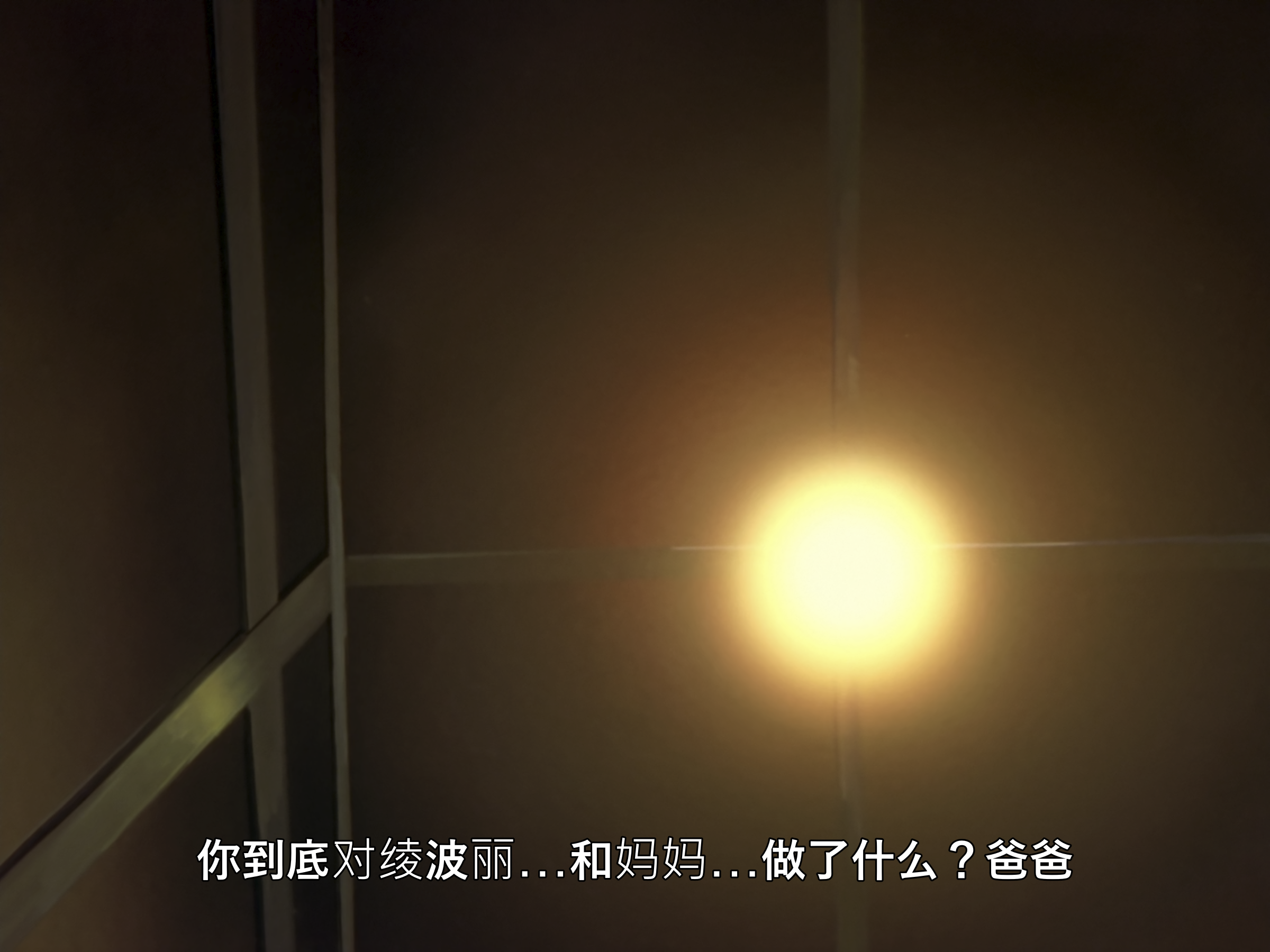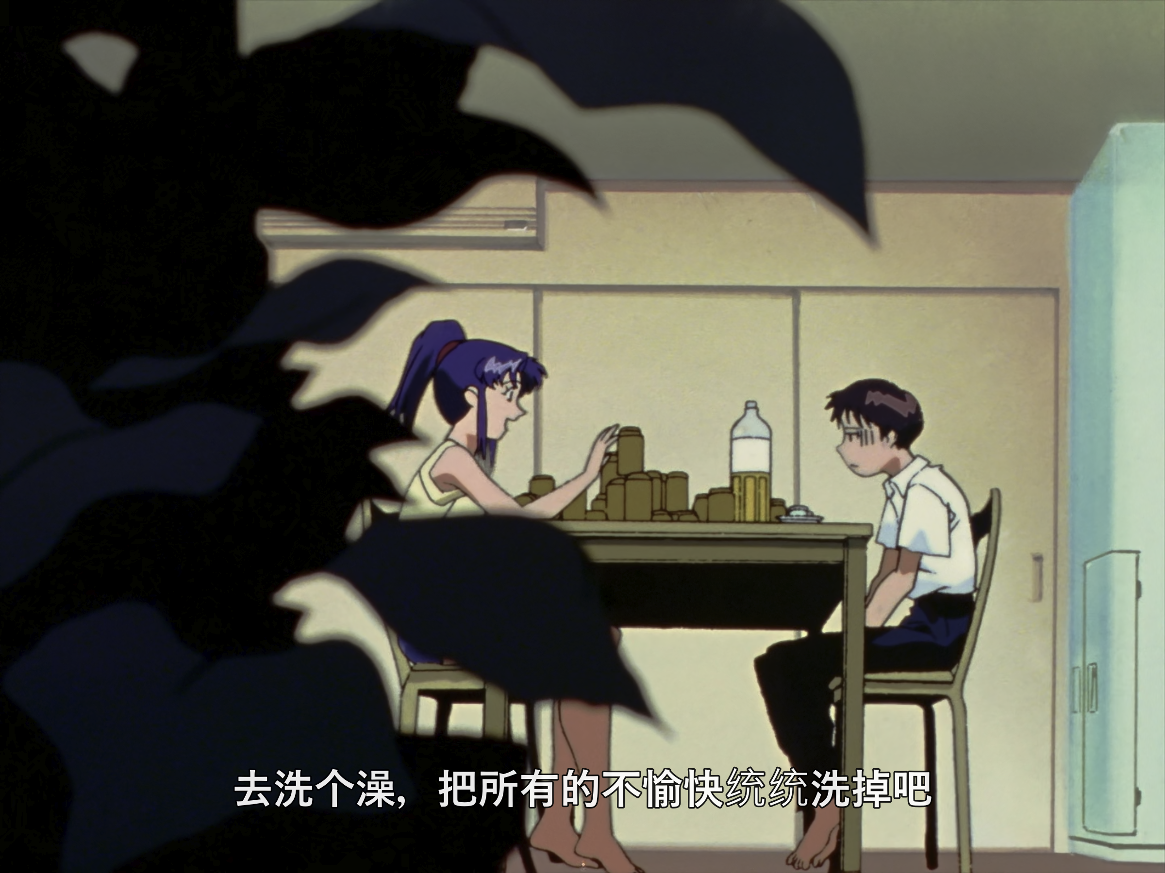 这个视角也很有意思,切换到真嗣场景的时候有低沉的嗡嗡声,应该是冰箱运行的声音,美里场景时是没有这个声音的。