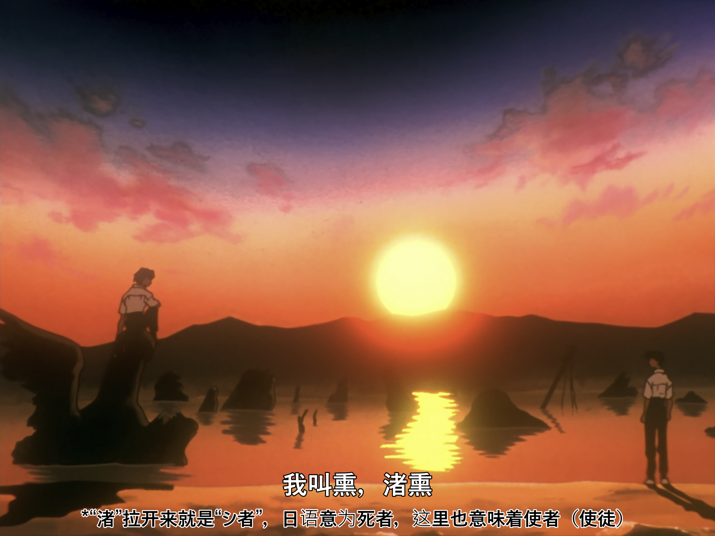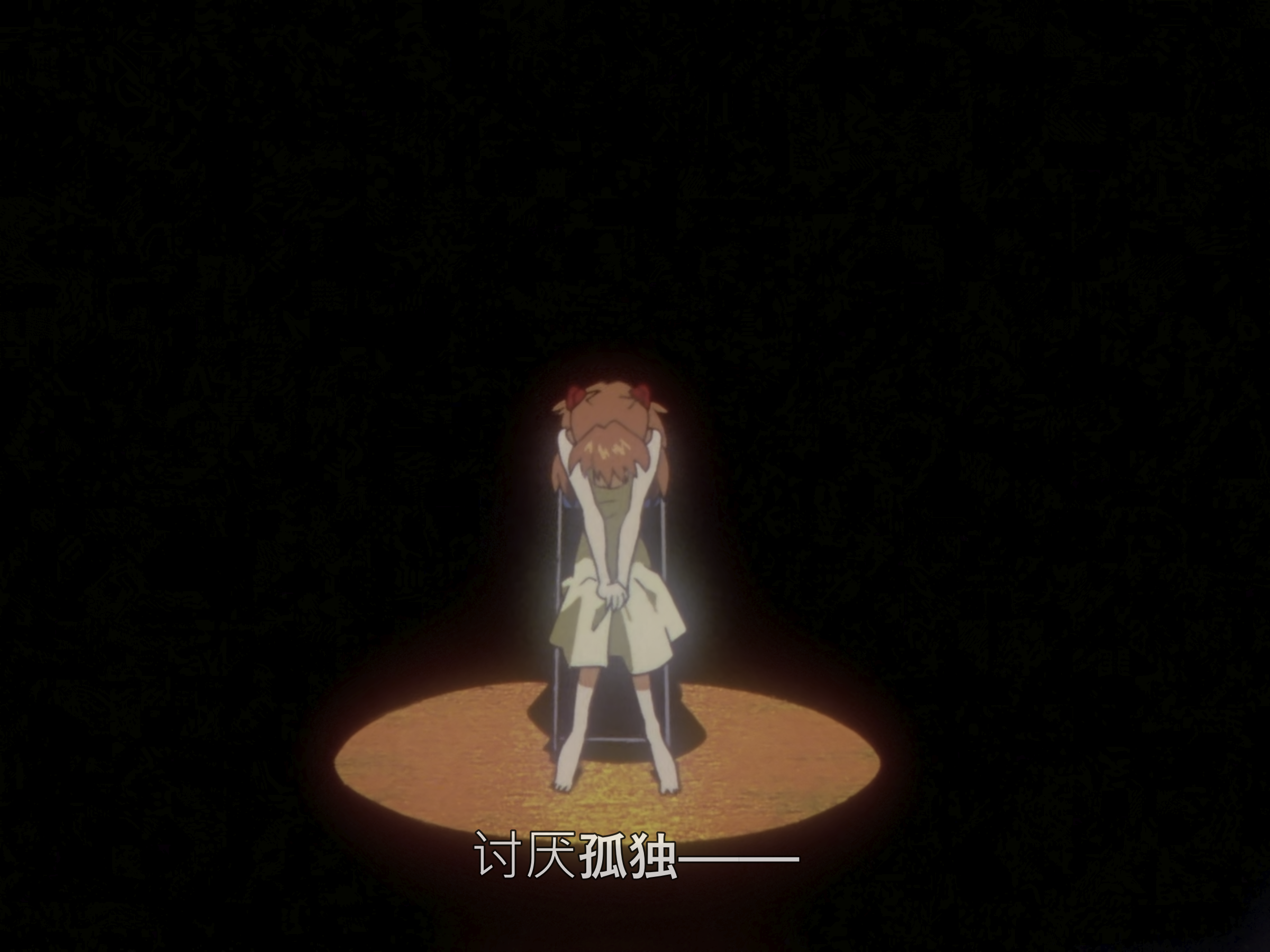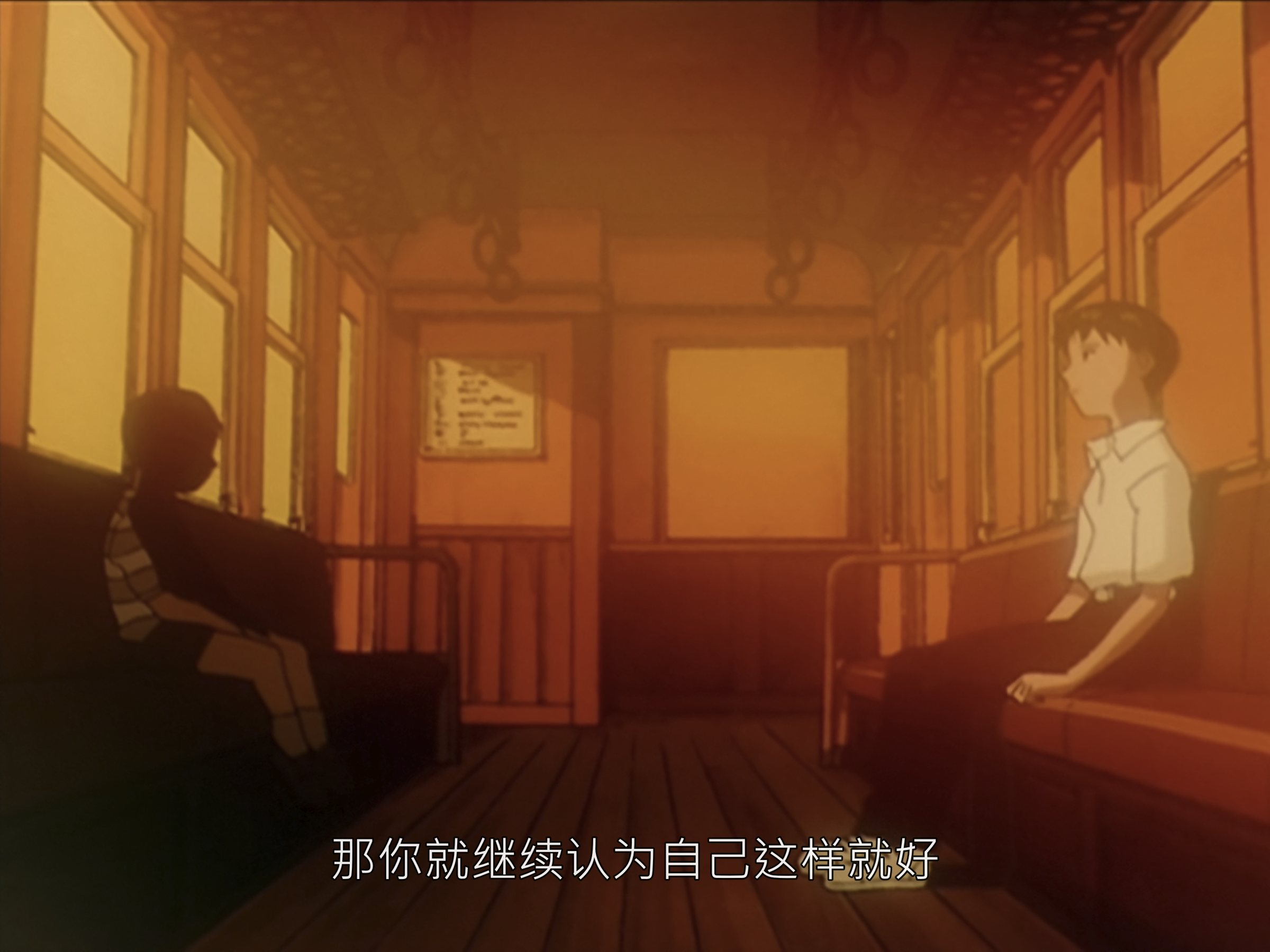 人在自己心中还有另一个自己,所谓的自己总是由两个人组成的:现实中被人看着的自己,和看着自己的另一个自己。每个人心中都有一个碇真嗣,你就是害怕别人心中的碇真嗣。我害怕被别人讨厌。其实你是害怕自己会受伤。错的人是谁呢?那是你自己认为什么都做不到吧。继续欺骗自己。大家都是这样啊,无论是谁都是这样活着的。那你就继续认为自己这样就好,否则你会活不下去的。因为要活下去的话,这世上痛苦的事情太多了。这是自我欺骗。不管你怎么说我都没关系。对讨厌的事情你不就是遮住眼睛,捂住耳朵活到现在吗?看吧,你又在逃避了。只把快乐的事情像念珠那样串在一起是没有办法活下去的。尤其是我。我找到了快乐的事情,找到快乐的事情然后只做那件事又有什么不对。