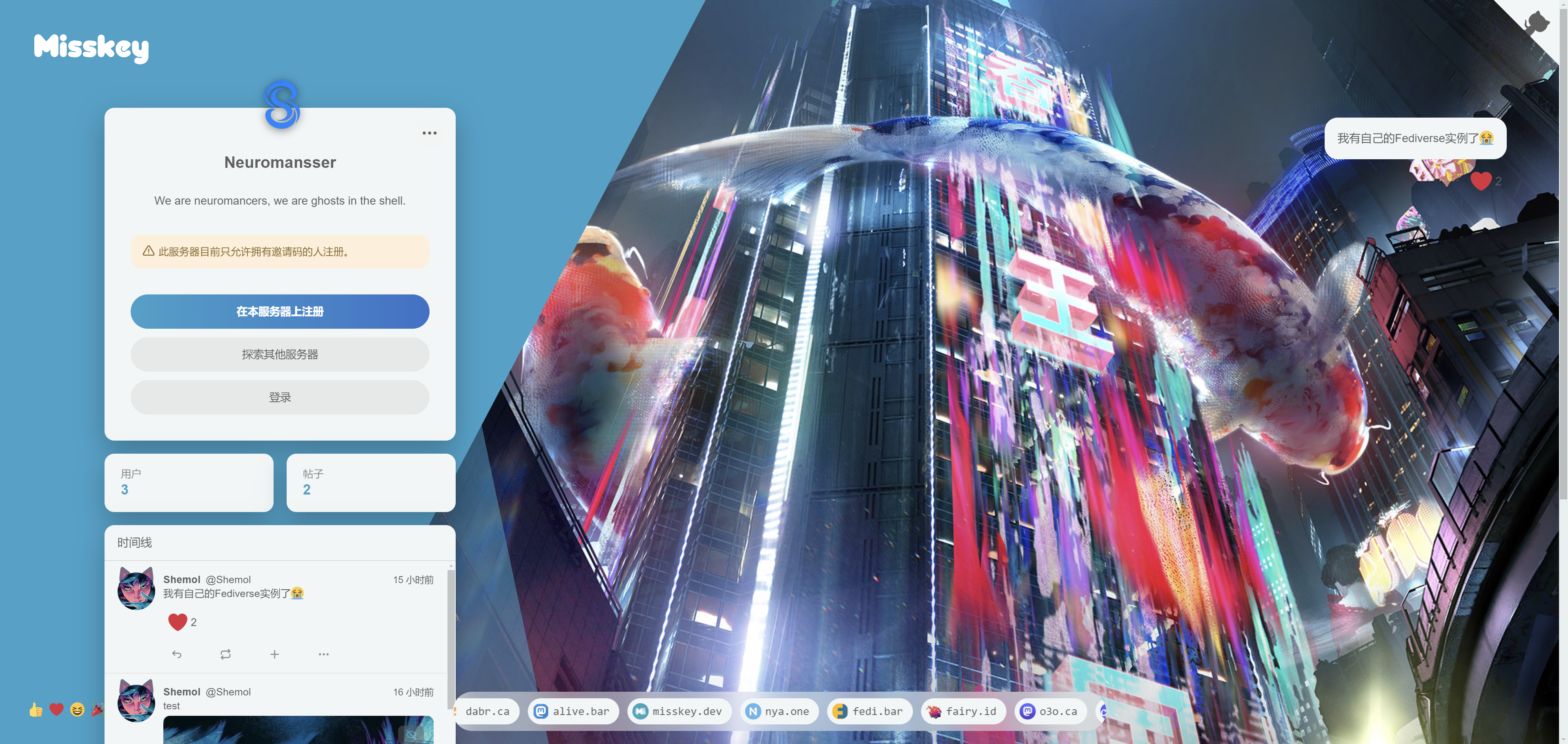 提交完论文,我就开始着手搭建自己的misskey实例,选择的域名是neuromansser.tech,neuromancer->neuromansser,目前大概是这个样子。