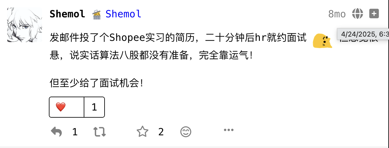每次焦虑就会投实习试试水,今年年底的时候也是同样,投实习获得了三个小厂的面试机会。十二月的最后一天面了两个,我就明白自己的问题了。仍然是算法和八股,项目经历也需要符合岗位特点。我发现哪怕我在面试前再紧张,对着面试官的时候,也不再有紧张的心情了。仿佛进入了面试的心流中,只顾回答问题,全然不会考虑其它。就是这样面试完会很累。