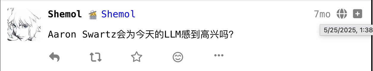 我仍然想问出这样的问题,Aaron Swartz会为今天的llm感到高兴吗?一方面是人们获取知识更加容易了,但是另一方面,就如Rob Pike所说的,开源代码被拿去训练反过来却造成技术垄断,这一定不是Aaron想要看到的吧。