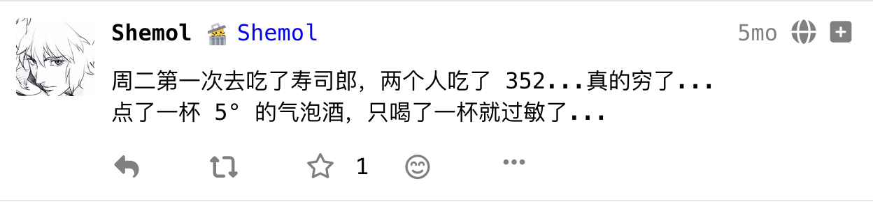 滨寿司应该是今年的年度餐厅了,去了很多次。寿司郎后来去过一次,花了三百多,就不敢再吃了。